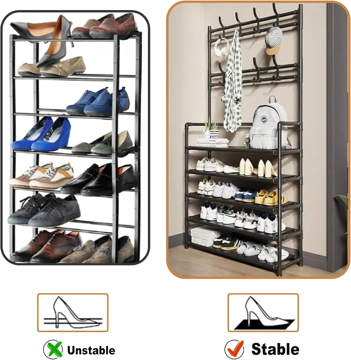 - A perfect shelf, coat rack and shoe rack. So you can hang your clothes ,hats, keys, bags, umbrellas, and store your shoes, boxes or handbags.